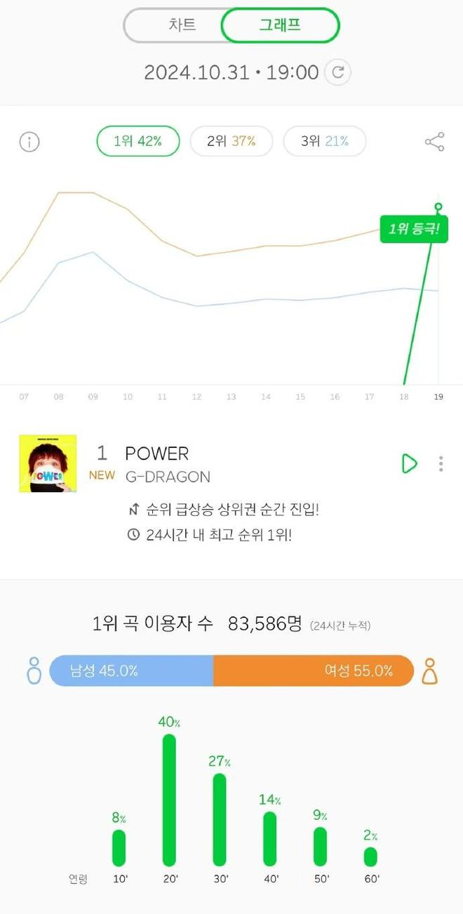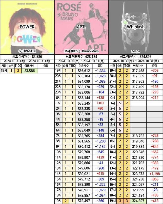 Bigbang权志龙的先行曲《POWER》空降Melon实时榜单第一位,首小时83586的收听,大家已经多久没在Melon音源榜看到这个数字了,这就是权志龙的国民度,要知道这还仅仅是先行曲的成绩,这才是韩流乐坛真正的音源大雾,面对BLACKPINK成员ROSE和火星哥的全球大爆曲《APT》,权志龙新曲依然不甘示弱,空降榜首。