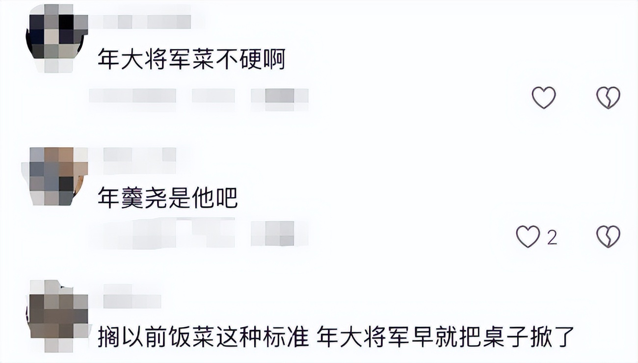 对于难得回老家走亲的杜志国,亲戚准备了一桌菜肴,有炒蒜苗,土豆丝,萝卜丝等,7道菜6道都是素菜没有一道硬菜,对此,有网友留言表示:“年大将军菜不硬啊”“搁以前饭菜这种标准,年大将军早就把桌掀桌了”。