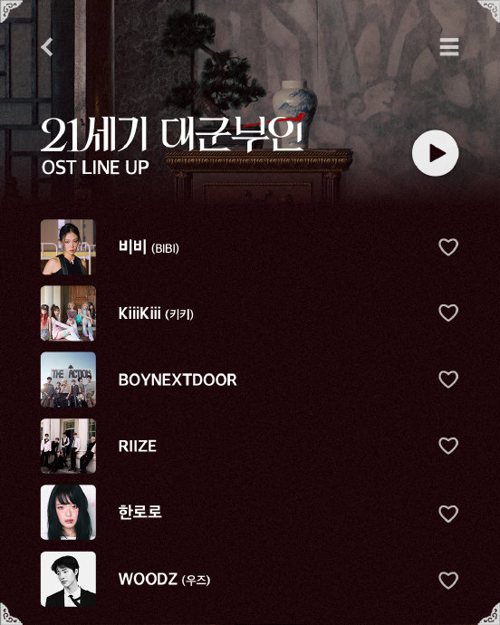 《21世纪大君夫人》凭借架空王权的创新设定、顶流主演与电影级OST阵容,持续引爆全球追剧热潮。观众可锁定每周五、六晚更新,感受王室漩涡中淬炼的真爱;而11组音乐人倾力打造的OST,正以多元曲风为这场跨越阶级的罗曼史谱写灵魂注脚。