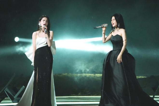 至于帮唱秀《盛夏》,萨顶顶和薛凯琪一黑一白的造型很美,再搭配芒果超绝的舞台置景,氛围感是有的。