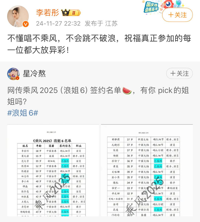 27日晚,李若彤在社交平台发文,否认参加乘风破浪的姐姐第六季,并表示:不懂唱不乘风,不会跳不破浪,祝福真正参加的每一位都大放异彩!