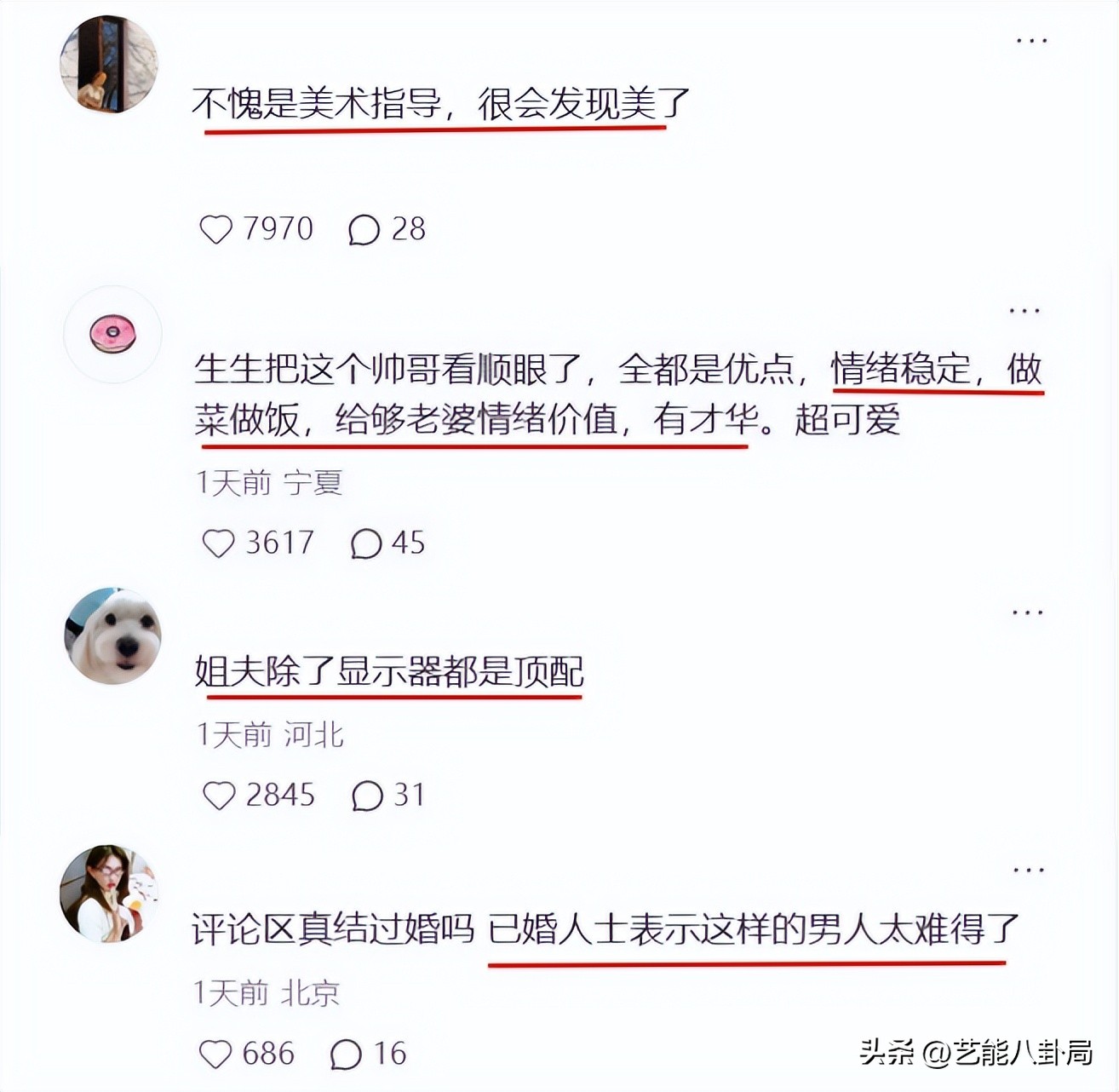 但看了杨雪的视频后,网友们纷纷表示理解,“生生把她老公看顺眼了,全都是优点,做菜做饭,给够老婆情绪价值,有才华。”“姐夫除了显示器都是顶配!”“已婚人士表示这样的男人太难得了。”“情绪稳定的老公才是婚姻顶配,比帅哥靠谱多了!”