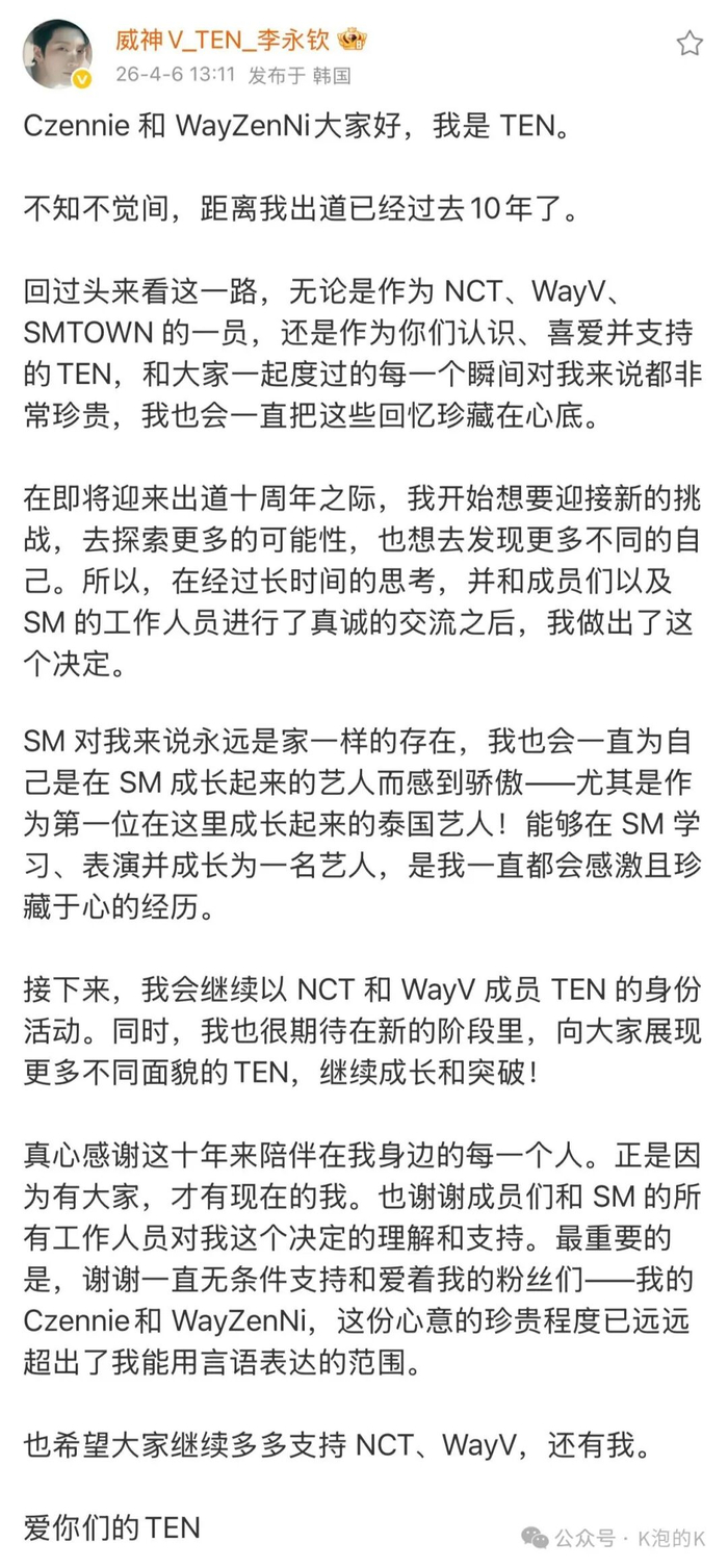 “接下来,我会继续以 NCT 和 WayV 成员 TEN 的身份活动。同时,我也很期待在新的阶段里,向大家展现更多不同面貌的TEN,继续成长和突破!”