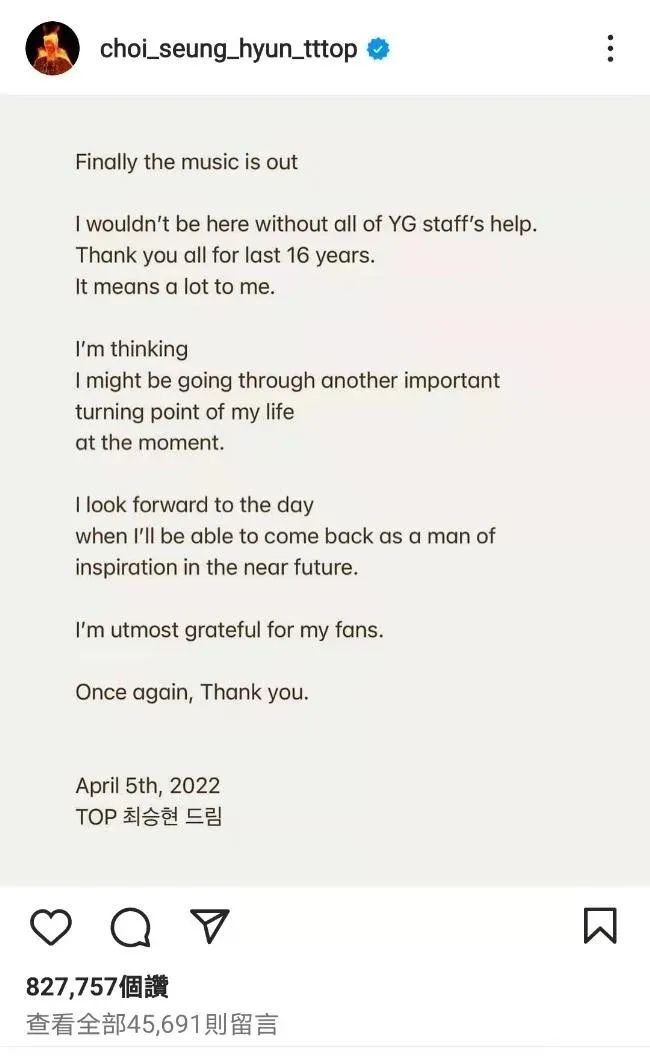 昨日傍晚,T.O.P在个人IG PO文侧面落实了这一消息:「音乐终於发行了。如果没有YG工作人员的帮助我不可能在这里。为过去的16年感谢大家。对我而言意义重大。我想我现在可能正在经历人生中另一个重要的转捩点。很期待不远的将来我可以作为富有灵感的人回到大家身边。对我的粉丝们无比感激。再次感谢大家。」