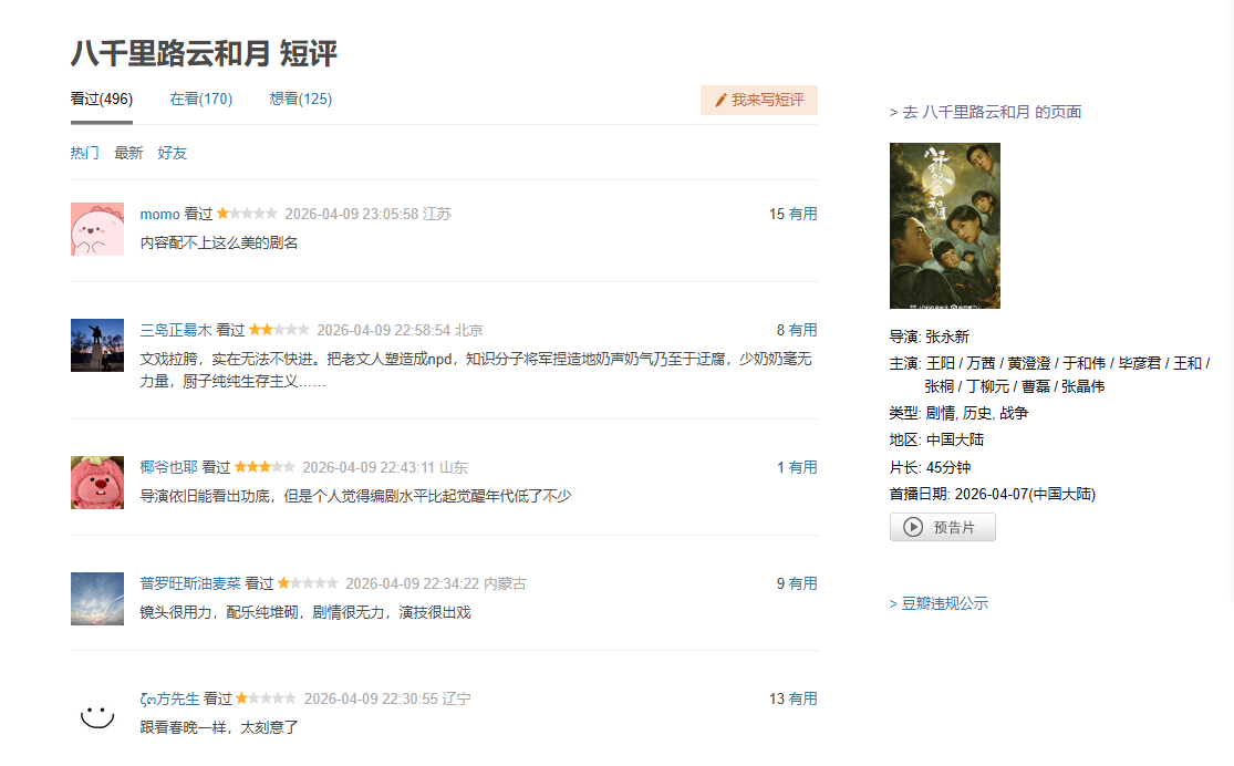 4月10日,电视剧《八千里路云和月》播出至第8集。该剧目前形成的收视率、网播数字和观众口碑情况,可以做一次纵览了。收视率方面,CVB上,该剧首播收视相对一般,次日下滑严重。网络播放数字方面,该剧目前集均刚刚过250万。观众口碑方面,该剧在豆瓣短评区域,已经出现了连成一片的差评。
