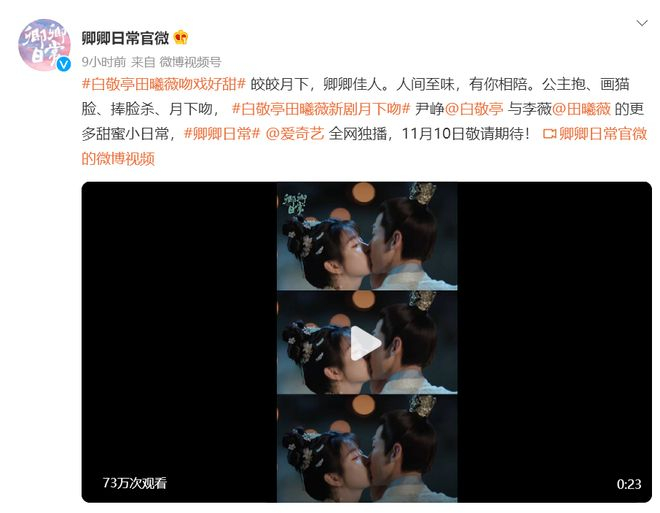 11月8日,卿卿日常官方微博发文称皎皎月下,卿卿佳人。人间至味,有你相陪。公主抱、画猫脸、捧脸杀、月下吻,11月10日敬请期待!官宣了这部剧开播的时间。
