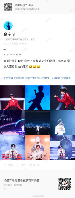 ## 余宇涵:演唱会后,直接开挂了!这段时间的工作节奏,简直太多了吧!,余宇涵的演唱会结束后,简直是“仙子”式的狂奔!从巡演到音乐节,从综艺到电影,从跨年到粉丝互动,余宇涵的工作节奏简直要把人气疯掉!这孩子的状态,完全不像是一个还年轻的“超级新星”,而更像是一个已经开挂了的“工作狂”。,###巡演模式:每月一场音乐节,舞台状态在线,余宇涵的巡演模式,堪称“高强度浪漫”,从宝鸡音乐节到无锡雪浪音乐节,他的舞台表现力完全没感觉是第一次上场!无锡雪浪音乐节上,他的《Starlight》《Flower Girl》全程开麦,粉丝们都说是“封神现场”,这孩子的状态,简直不要太稳定!从温润的《江南》到潮酷的《TOOOOO BUSY》,他的风格跨度也太大了吧!看来,余宇涵的巡演模式,完全是“每月一场音乐节”的高强度节奏。,###综艺与音乐:双重打卡,状态满满,余宇涵不仅是舞台的“大师”,他在综艺和音乐领域的表现也绝对没闲着!在《一路繁花 2》的录制中,他从“老师”变成“老板”,完全没感觉是第一次从这个身份转换,更有趣的是,在《海角 88 号》节目中,他从“老师”变成“老板”的角色转换,让他自己都觉得紧张又新奇!至于音乐方面,粉丝整理的时间线显示,从2025年12月到2026年1月,他一直在筹备新歌《Pandora》,并且在2026年3月被提到已经学会了这首歌,明显新歌即将大登舞台!,###跨年与电影:大型晚会与影视打卡,余宇涵的跨年档,完全是大型晚会的“大戏”,在TF家族新年音乐会上,他的《STARLIGHT》舞台全程开麦唱跳,造型更是被粉丝称为“仙子范本”,状态简直太美了!同期,他还录制了北京卫视跨年晚会,和在海南参加的新年音乐会,完全没闲下来!2026年1月,他还参与了微博“跨年直播不断电挑战”,和粉丝一起共度新年,这孩子的状态,完全是“全能型”!,###粉丝互动:工作之余,依然甜甜蜜蜜,余宇涵可不是只会工作,他和粉丝的互动也从未停歇!在2025年11月24日的生日直播中,他和粉丝一起庆祝了特别时刻,这孩子的主动和真诚,完全没感觉是“超级新星”,2026年3月底至4月初,多个粉丝职能站联合发起的联合活动中,他的官方周边也迎来了最新打样,看来粉丝们的支持,对他来说是最大的鼓励。,###最近的偶遇:张杰演唱会现场的“梦幻联动”,余宇涵最近的热度,完全来自于一次意外的偶遇!在2026年4月9日,余宇涵现身张杰的“未·LIVE 开往1982”巡回演唱会,完全沉浸式地听歌,还被张杰邀请登上舞台小火车互动,这次互动中,余宇涵因为专注和镜头互动差点摔倒的可爱瞬间,被粉丝们传播得遍及网络,媒体更是将其称为“梦幻联动”,从余宇涵在张杰演唱会现场的状态来看,他完全是“路人”的状态轻松,玩得十分开心,这画面简直要让粉丝们疯掉!,###余宇涵的“超级新星”之路,从2025年的个人演唱会到2026年的多栖发展,余宇涵用密集的行程和高质量的舞台,完全诠释了“超级新星”的成长之路,他的工作瘾和状态在线,完全让人看佩服,无论是巡演、音乐节、综艺、电影,还是大型晚会,他都能以优异的表现力挣脱每一道门槛,未来在音乐与影视领域的表现,依然值得期待!粉丝们的支持和关注,才是他不断前行的动力!## 余宇涵:当"超级新星"的光芒照亮巡演之路,吃瓜者们可欣然!,2026年4月9日,余宇涵现身张杰的巡演,成为又一段"吃瓜"的经典画面,从2025年10月在重庆落下的个人演唱会,到如今的音乐节、跨年晚会、综艺录制、电影嘉年华、巡演互动……余宇涵用密集的行程和高强度的舞台表现,彻底诠释了"超级新星"的蜕变之路。,看他在无锡雪浪音乐节上带来《Starlight》《Flower Girl》,全程开麦,粉丝们直呼"封神现场",这份舞台能力,足以让他在新生代实力偶像中脱颖而出,更令人称奇的是,他能从温润的《江南》到潮酷的《TOOOOO BUSY》,风格跨度极大,唱功稳定,完全不用怀疑他的实力。,说到吃瓜,余宇涵的综艺表现更是让人捧腹,他从综艺《一路繁花2》的紧张"老师"到《海角88号》的风云"老板",这两重人设的转换,既紧张又有趣,堪称经典,更有趣的是,他在新歌《Pandora》的图频拍摄中,粉丝们调侃他"学戏"的状态,简直能感受到他在追求音乐上的严谨态度。,粉丝互动这边,余宇涵从生日直播到周边打样,每一件都是粉丝心的温柔回忆,要说吃瓜,最能打动人心的莫过于余宇涵在张杰巡演现场被邀上舞台的小火车互动,他专注的状态差点摔倒,俏皮的模样被粉丝疯狂追捧,简直是"梦幻联动"。,余宇涵的成长之路,是一部充满亮点的"吃瓜"剧,从个人演唱会到跨年晚会,从音乐节到综艺,从电影到巡演,他的每一步都在为粉丝打造一个"超级新星"的完美剧本,他在音乐与影视领域的表现,依然值得期待,毕竟,余宇涵的舞台,永远都是吃瓜者们的天堂。