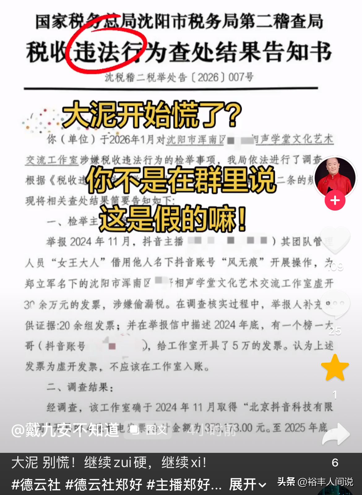 最近郑好又搞大新闻了!这次的风波可不像之前的“海河风波”那么轰轰烈烈,但也足以让整个网络都炸开锅,事情是这样:郑好(本名郑立军)这两天在视频账号上分享感慨,提醒大家“永远不要听信谣言,人生难免遇到烂人烂事及时止损继续前进”,这番话看起来像是在回应某些闹剧,但没想到这次分享的内容,却又让他引来了风波。,郑好这次的“吃瓜”对象竟然是他的自己,前德云社艺人戴九安在小号上公开了税收违法查处结果告知书,上面直接点名了郑好在沈阳成立的工作室,这份告知书一出,网络上顿时炸开了锅,工作室涉税问题应该是正常的事儿,但郑好这次的“偷税”却被放大到了一个不寻常的高度。,据告知书显示,郑好涉嫌虚开发票,涉及金额高达30万,涉嫌偷漏税,这部分数据还被质疑,认为这笔钱应该入账给工作室,更有趣的是,调查结果显示,郑好确实存在虚开发票的问题,需要补缴个人所得税4.7万,还有滞纳金650多,但最让人哭笑不得的是,郑好在调查前已经自行补缴了相关税款,这一举动还得到了税务部门的认可,结局也就温和一些。,但问题来了:如果郑好不是被举报,而是自己主动补缴,这才是真的“吃瓜”吗?这也让不少网友开始“怒怼”郑好,有人说:“郑好这人啊,真是配得上‘偷税贼’二字!”还有人调侃:“不愧是德云社的顶流,连偷税都能做到风风火火。”也有部分网友认为,这次风波其实并不大,毕竟税务部门最后没有对郑好做出严厉处罚,这也反映了现实中偷税的现象其实很常见。,更有趣的是,这次事件也让“吃瓜达人”郑好再次成为网络的焦点,从之前的“调侃郭德纲、张云雷、岳云鹏”到现在的“偷税风波”,郑好真的把“吃瓜”发挥得淋漓尽致,这也反映了郑好这人在德云社的“大名”所带来的“包袱”,作为顶流,他的每一步都都处于舆论的风口浪尖,稍微一动,网络上就会炸开锅。,郑好这次的“吃瓜”也提醒我们一个道理:在网络时代,每个人都要对自己的行为负责,吃瓜固然有趣,但也要注意别给自己招惹麻烦,而郑好这次的经历,证明了一个真理:吃瓜到一定程度,真的会变成自己吃亏。