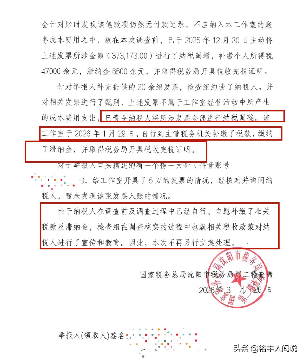 调查结果显示,30多万的发票虚开的确存在,需要补缴个人所得税4.7万,以及滞纳金6500多。