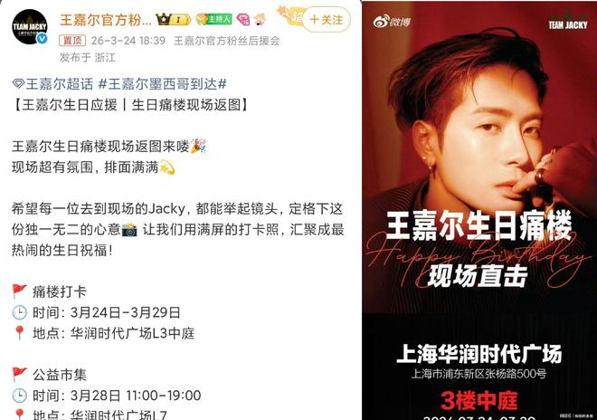 2026年3月28日是歌手王嘉尔的32岁生日,从3月24日开始,他的粉丝就在上海、广州、深圳、武汉、长沙等全国多个城市的核心商圈,搞了一场名为“微博痛楼”的大型线下庆生应援,从跨楼层的巨型吊幔、满铺的高清海报,到专属互动装置和公益市集,整个活动声势拉得很足,相关话题刚上线就冲上了社交平台热搜,引来全网网友的围观和讨论。