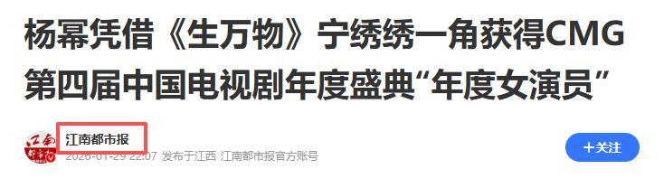 江南都市报|杨幂凭借《生万物》宁绣绣一角获得CMG第四届中国电视剧年度盛典“年度女演员”