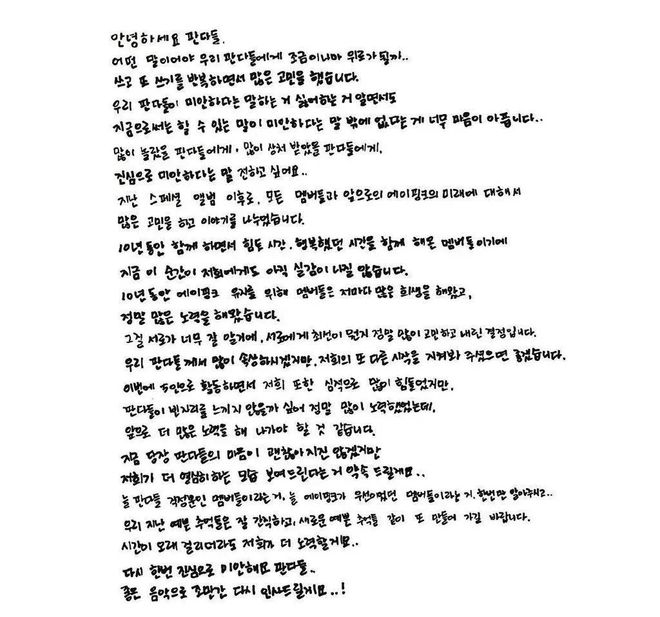 队长初珑也在Apink官方IG PO出亲笔信:「Panda们应该很惊讶很受伤吧,真的很对不起...... 上次特别专辑之后,所有成员一起对Apink的未来做了很多思考和讨论。成员们一起走过了10年时间、分享过幸福的时刻,所以现在这瞬间我们也仍然没有实感。」