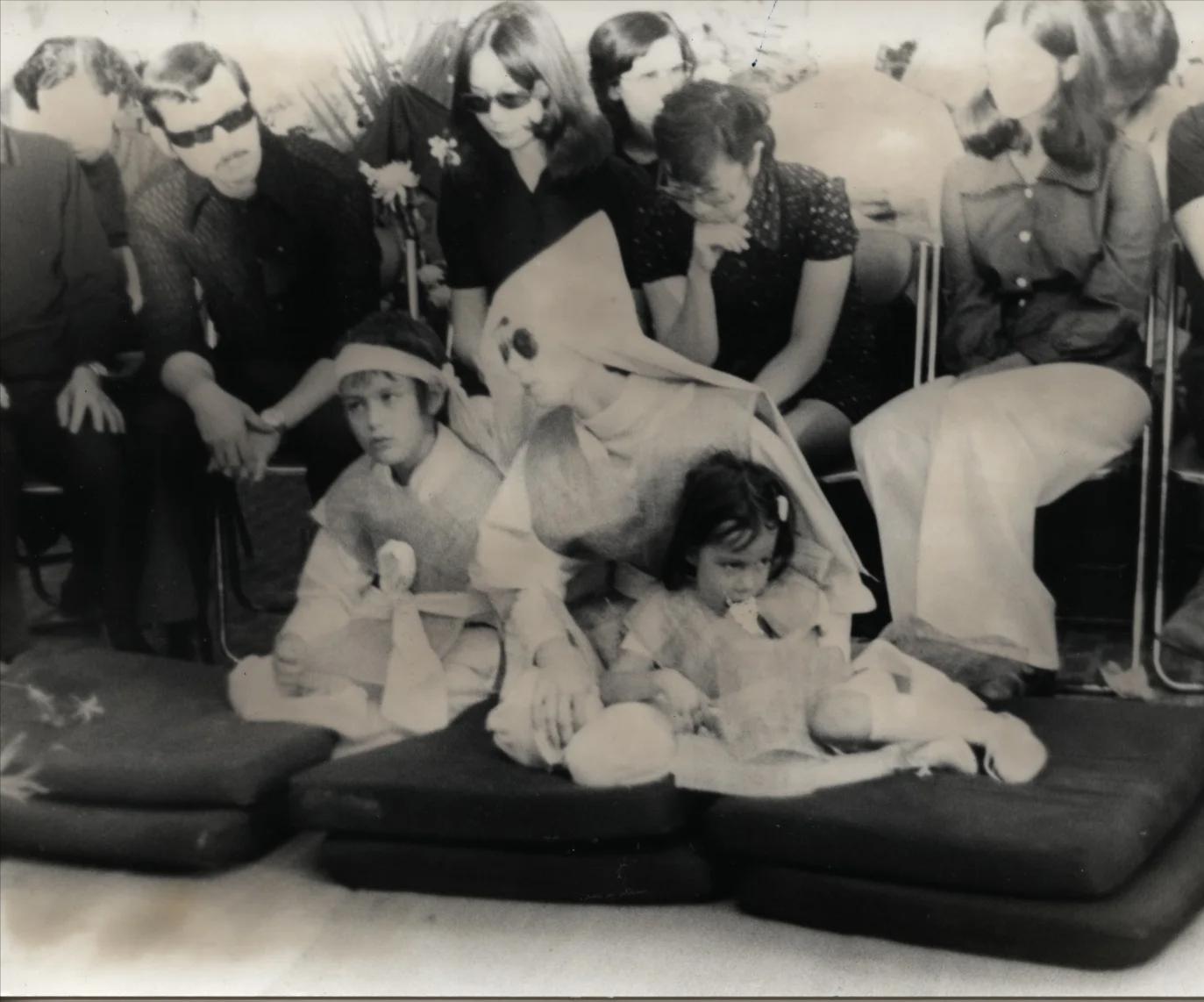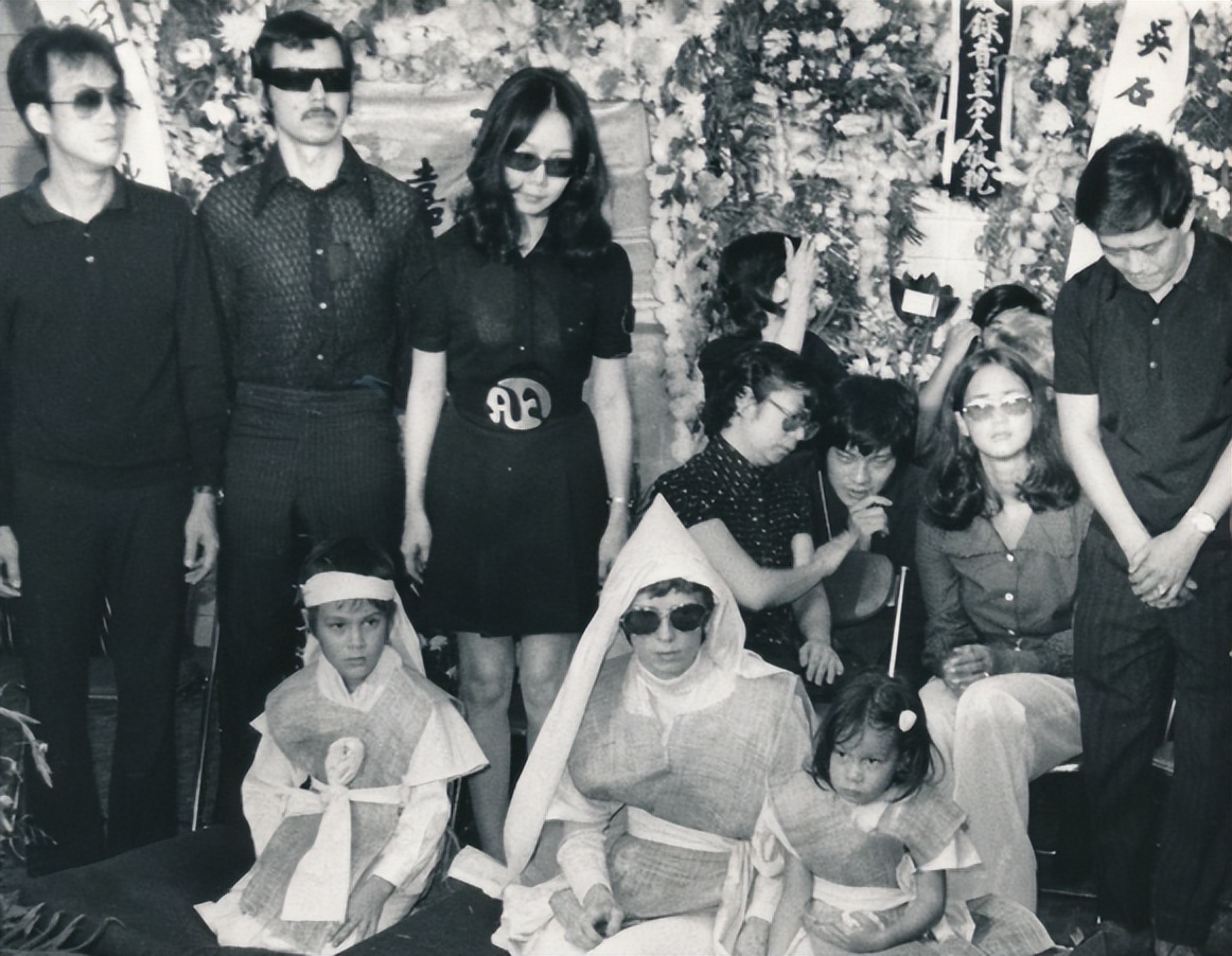 李小龙的葬礼上,琳达与一对子女披麻戴孝,两个孩子似乎还不太明白发生了何事。