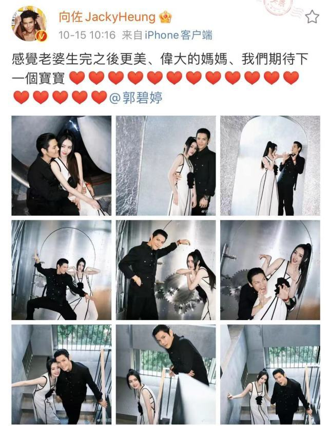 10月15号,向佐晒出一组自己跟妻子郭碧婷的写真照甜蜜撒糖,同时低调的官宣了郭碧婷怀上二胎的好消息,两人已经期待下一个宝宝了,换句话说,郭碧婷已经怀上二胎,两人正期待宝宝的到来。