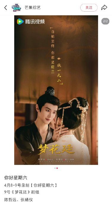 陈哲远与张婧仪合体录制的《你好星期六》于2026年4月9日完成节目录制,预计将于5月初(如5月2日或9日)在湖南卫视周六晚黄金档19:30正式播出,为观众带来《梦花廷》剧组的独家互动与高能笑点。