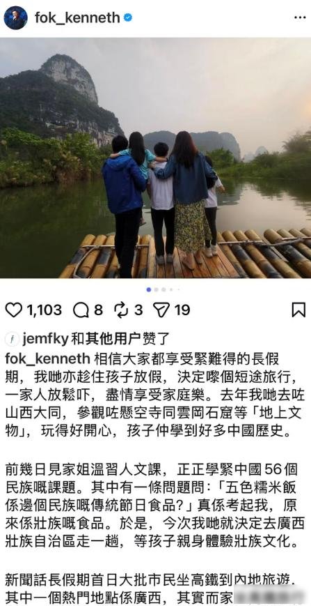 4月7日,霍启刚发布了一组照片,这不是旅游打卡的内容,而是记录了全家在广西参加的四天三夜研学活动,起因很简单,他11岁的大儿子霍中曦在人文课上遇到一道难题——“五色糯米饭属于哪个民族”,老师没有详细讲解,孩子记不住答案,霍启刚不打算让孩子死记硬背,便直接带着全家前往广西南宁,乘坐高铁只需四个小时就能到达,比坐飞机还快,也更省钱。