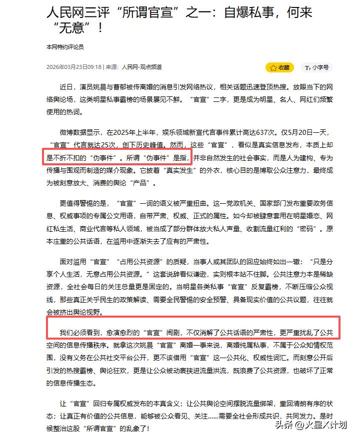 紧随其后,人民网发表了一篇题为《自爆私事,何来“无意”!》的评论文章,措辞严厉地将矛头对准了当下娱乐圈滥用“官宣”的乱象。