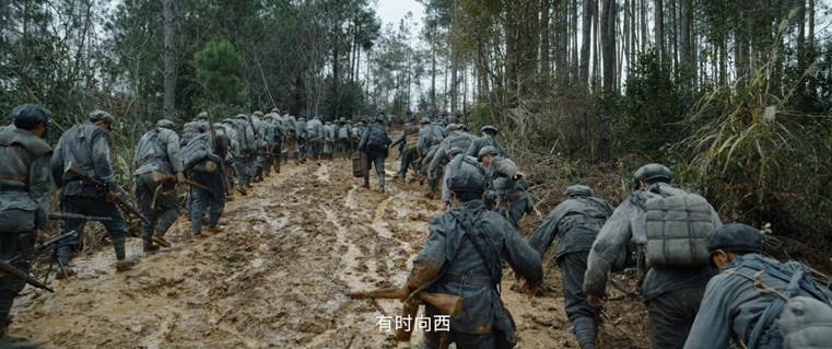 预告片用大量篇幅展现了红军跋涉的艰辛,他们在泥泞中艰难前行,每一步都深深陷入泥土。