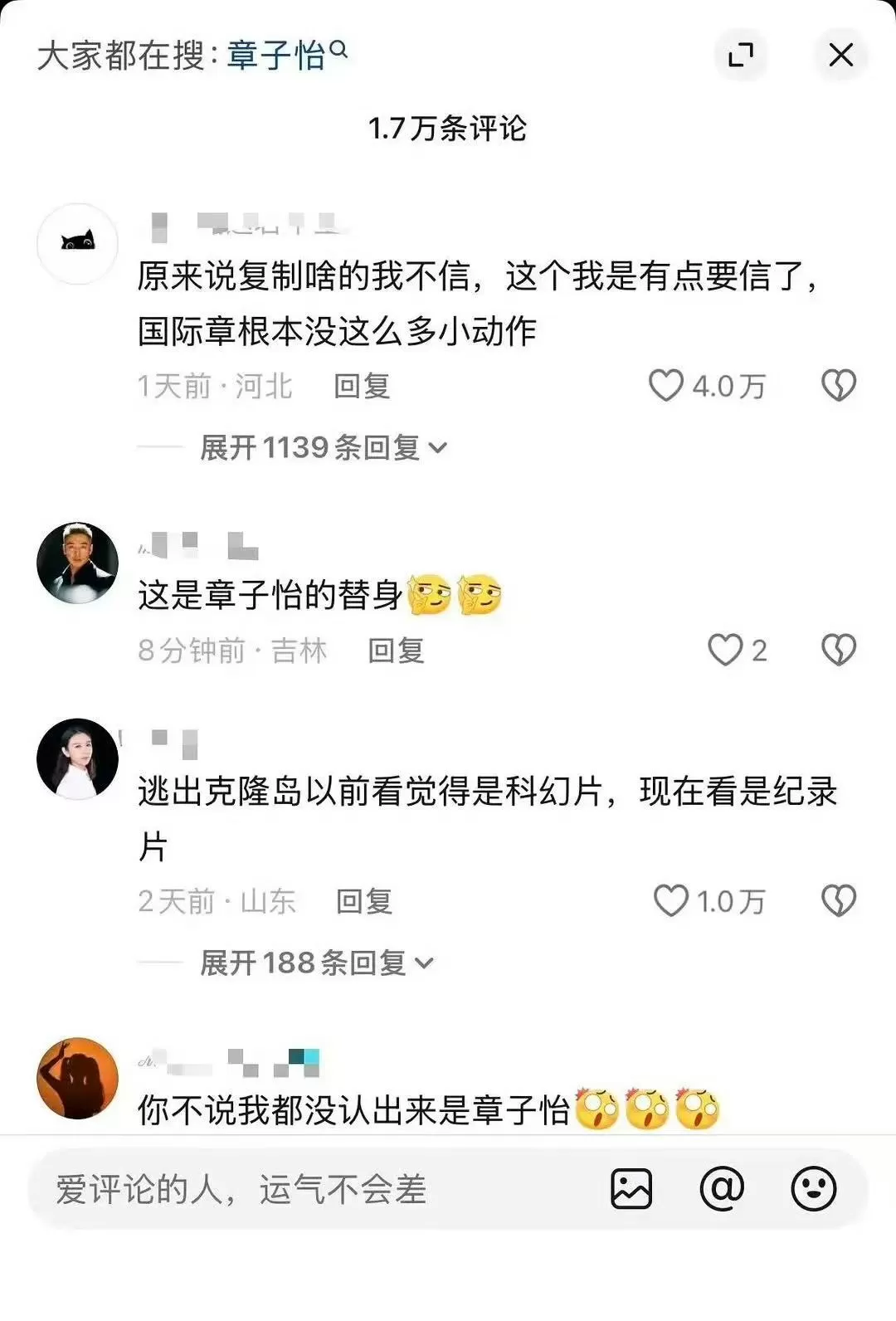 对章子怡的热议有一个截图显示热评1.7万条,很多网友说差点就没认出来这是章子怡,还以为是替身。网友的评论相当经常,居然还有人联想到了克隆人,太逗了!