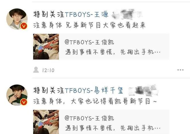 王源和千玺上线支持小凯的时间也很令人注意,他们二人一起上线转发的时间点都是12点10分,一样的时间给小凯转发支持,看来他们三人之间也一定是有商量好的,三人的互动真的好暖心!