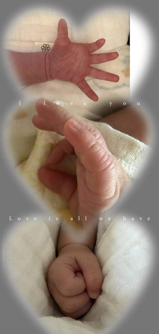 另一张是黑白剪影照,两人温柔对视,双手交叠放在孕肚上,爱意满溢;还有两张新生儿特写,柒宝的小手与父母大手相碰,画面治愈又暖心。