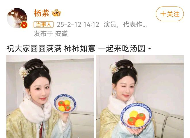 嗨!这里是娱乐寡姐,为你带来最新娱乐资讯。杨紫元宵节营业,晒正在拍摄新剧《家业》李祯的古装扮相手捧汤圆的照片,祝“大家圆圆满满 柿柿如意 一起来吃汤圆~”柿柿如意汤圆和大黄米汤圆,一看就很有食欲。李祯妆造也很好看,一看就知道剧组用心了,好期待《家业》啊!