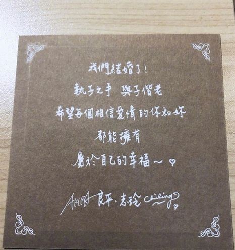 而在前不久,网上也曝光了林志玲结婚的喜帖,喜帖封面是林志玲和AKIRA的合照,喜饼选用了蛋卷和巧克力,邀请内容由林父撰写。