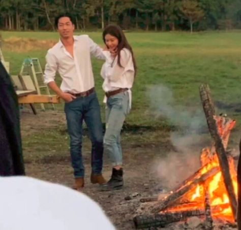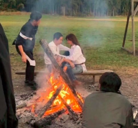 两人坐在长木凳上,正前方有个火堆。虽然被工作人员环绕着,但还是十分甜蜜,紧紧地挨在一起。