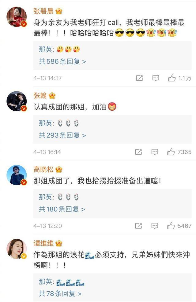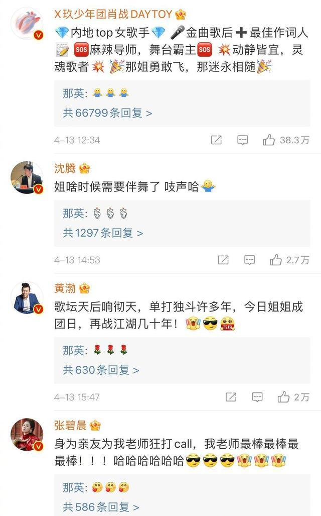 4月13日,那英在《浪姐》成团出道,获沈腾、黄渤、肖战、张翰、高晓松、张碧晨等半个娱乐圈打Call。