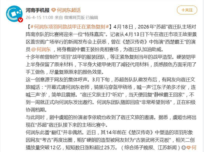 4月18日,2026年“苏超”联赛宿迁队主场对阵南京队的比赛,将迎来一位特殊嘉宾。据发布会消息,何润东将直接身着《楚汉传奇》中的西楚霸王战袍,现身赛场为宿迁队加油助威。这波操作,将“角色考古”直接落地为“文旅联动”,堪称神来之笔。更有意思的是,剧中虞姬的扮演者李依晓也收到了宿迁文旅的邀请,预计将在后续主场比赛中登场,“霸王别姬”CP有望在足球场上重逢。