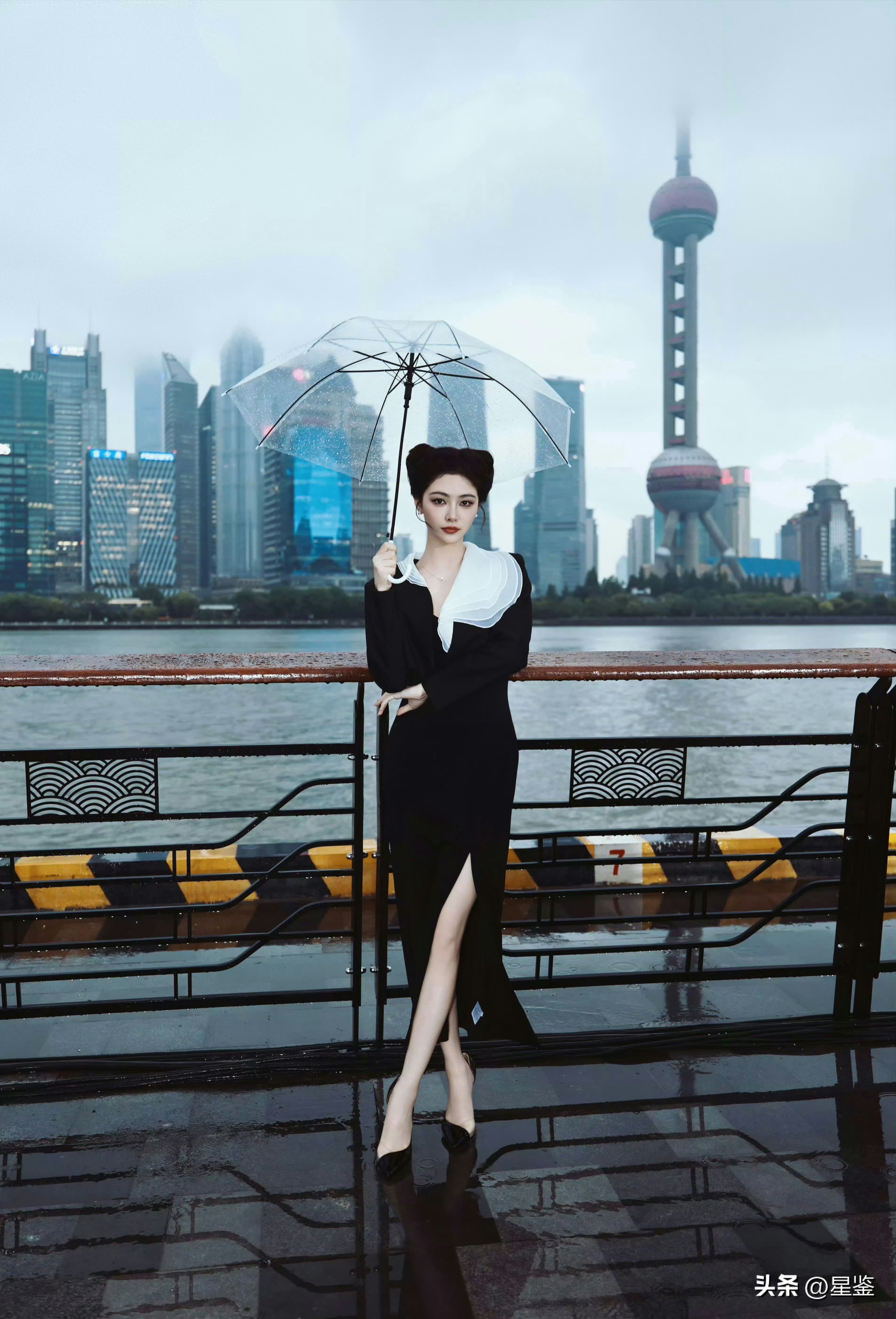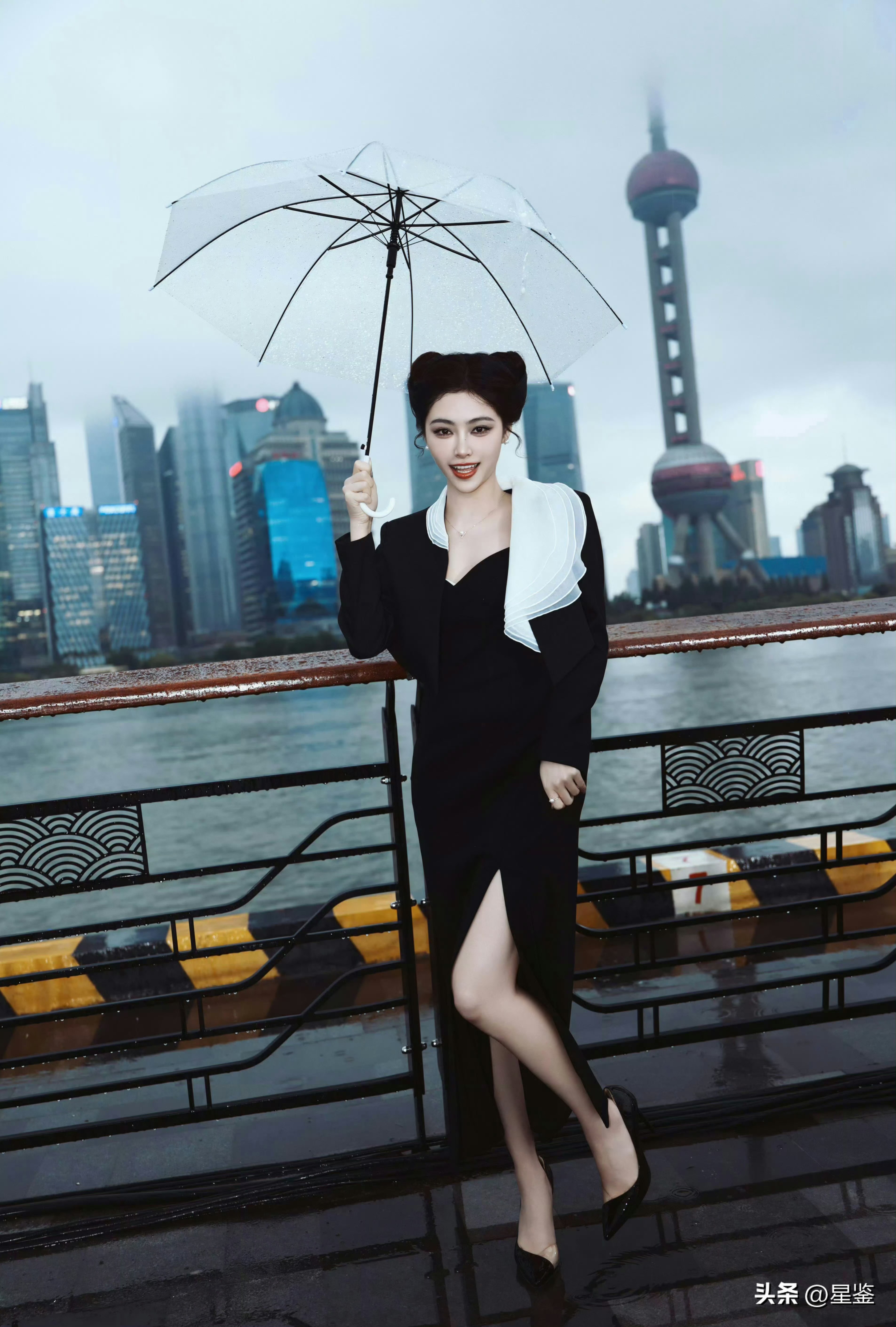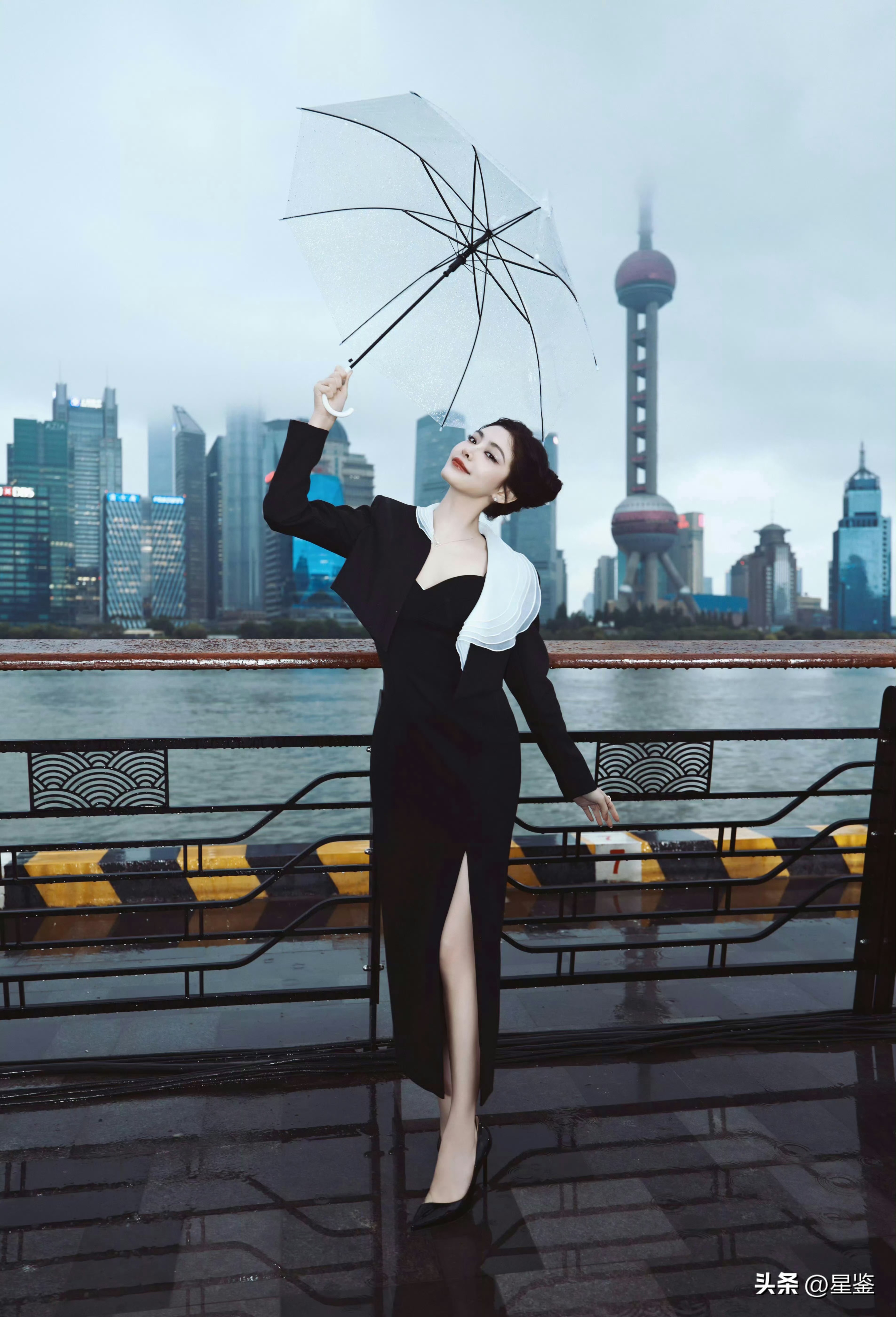 透明雨伞和湿漉漉的地面呼应,东方明珠在雾里若隐若现,整个画面都透着上海独有的氛围感。发型盘得精致利落,红唇点缀更添几分明艳,没有多余配饰却足够吸睛,把都市女性的干练与浪漫平衡得刚刚好,日常通勤或约会都能借鉴这种“少即是多”的穿搭思路。