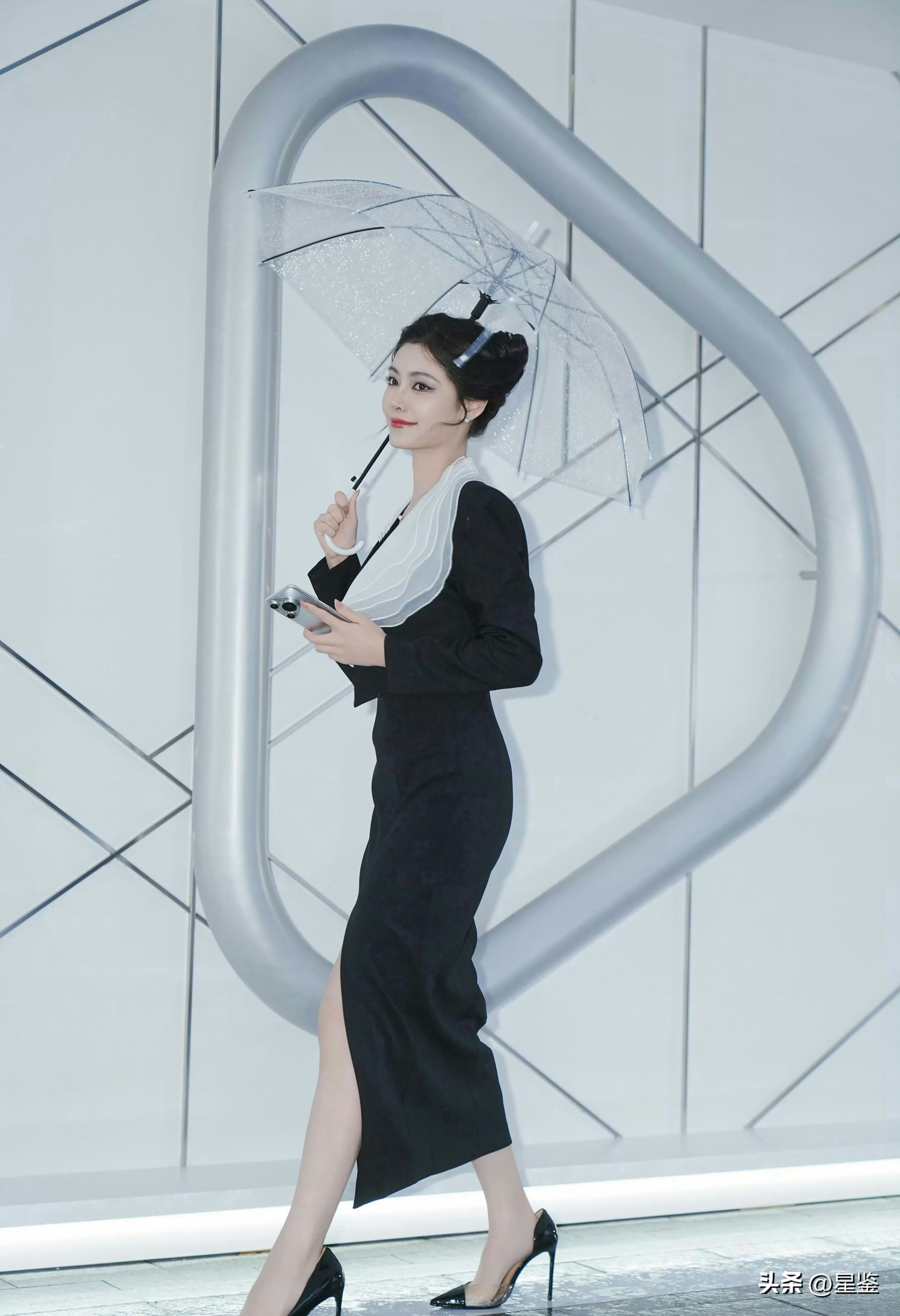 许佳琪这组外滩雨天随拍,把高级感拿捏得恰到好处。一身黑裙配短款西装,利落剪裁衬得身形修长,高开叉设计悄悄露出腿部线条,走路时自带摇曳气场。最妙的是领口那片层叠白纱,像落了片云在肩头,瞬间中和了黑色的沉闷,清冷又温柔。
