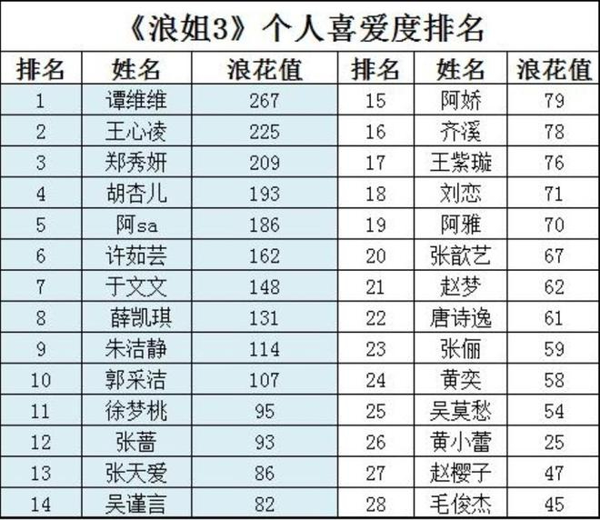 一公后人气最高的三位姐姐是谭维维、王心凌和郑秀妍,她们可谓断层领先,浪花值都在200以上。