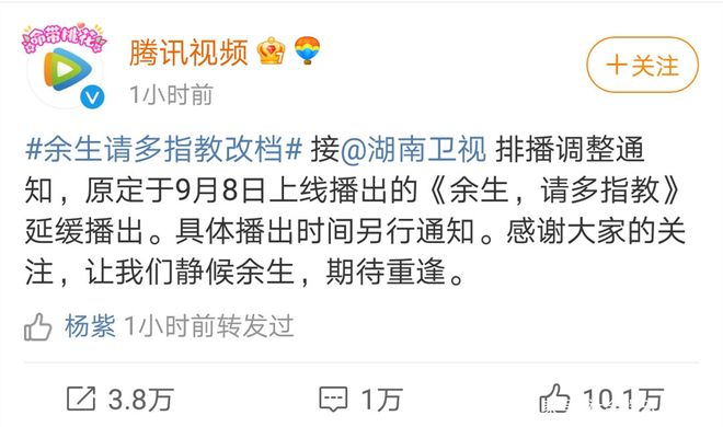 电视台与网络平台相继发出声明:因电视台频道编排调整,原定于9月8日上映播出的《余生,请多指教》,已确定延期,待播日期未定。