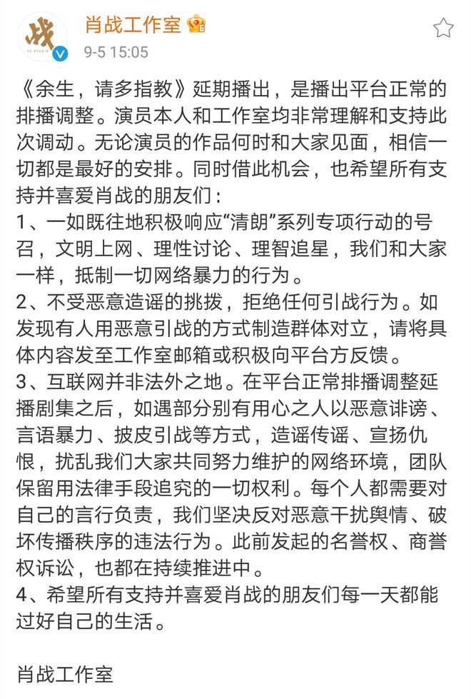 而肖战工作室还特意发出“倡议书”,强调关于这次“排播”的理解。提醒粉丝:“要文明上网,理性讨论;不受恶意造谣的挑拨,拒绝任何引战行为。”并再次强调:“互联网并非法外之地。”