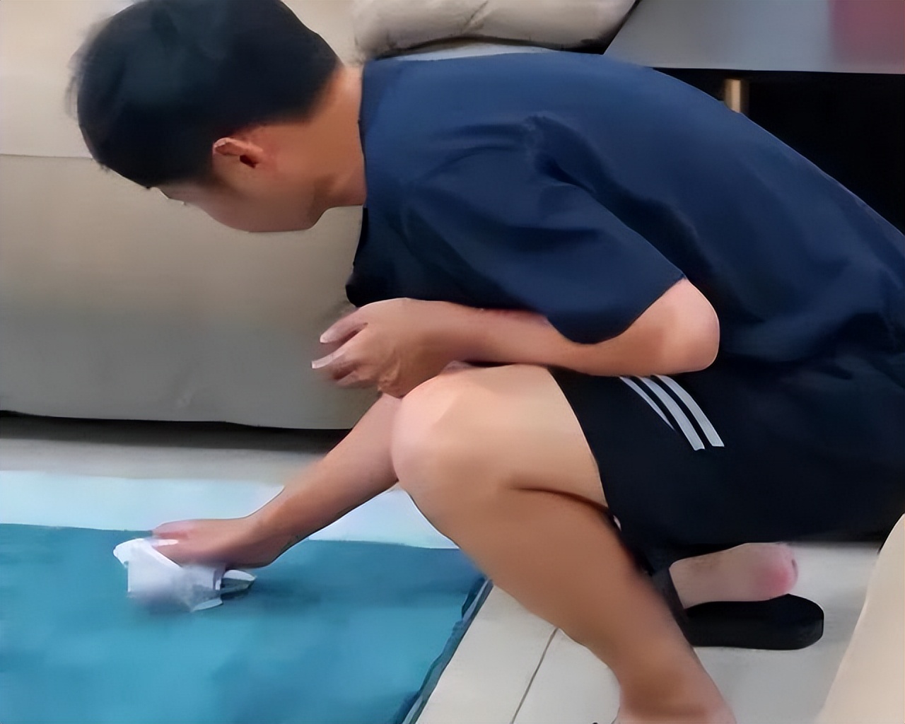 他每天至少擦上四五遍的地,地板必须得一尘不染,