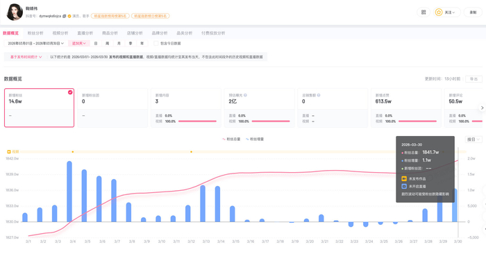第三方数据显示,鞠婧祎平台近30日涨粉14.6万,3月30日单日涨粉1.1万。