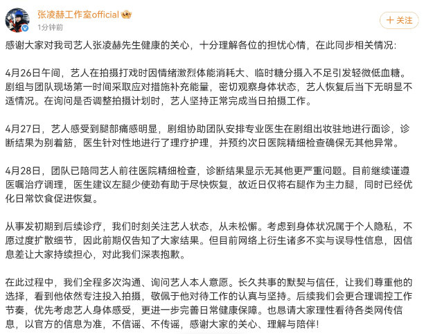 【#涉隐私工作室前期未说明张凌赫情况#】近期,艺人张凌赫拍戏身体不适一事在网络持续发酵,引发大量网友热议与多方猜测。4月28日,工作室正式发文回应其健康状况。