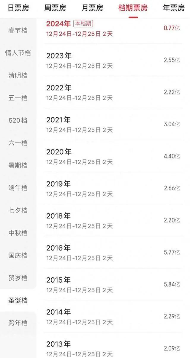 即将结束的圣诞档目前票房不足1亿元,创下近十年最低纪录。有人列出来了一个历年平安夜电影票房对比图,数据从2013年开始,到今年12年,断崖式下跌也不过如此。