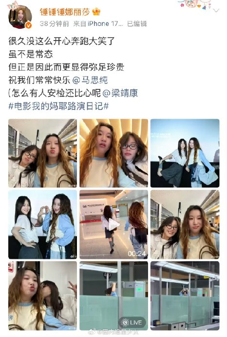 路演宣传电影《我的妈耶》期间,两人在重庆机场狂奔赶飞机的画面成为友情的鲜活注脚。锤娜丽莎发文感慨“很久没这样开心大笑了”,马思纯幽默接梗:“毕竟我俩的秀发值得炫耀!”镜头记录下她们手拉手冲刺的身影,过安检时甚至调皮比心,将匆忙狼狈的行程变成共享酣畅淋漓的青春记忆。这种无需偶像包袱的松弛感,让网友直呼“连赶飞机都变得可爱”。
