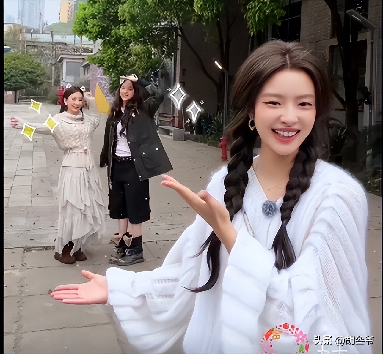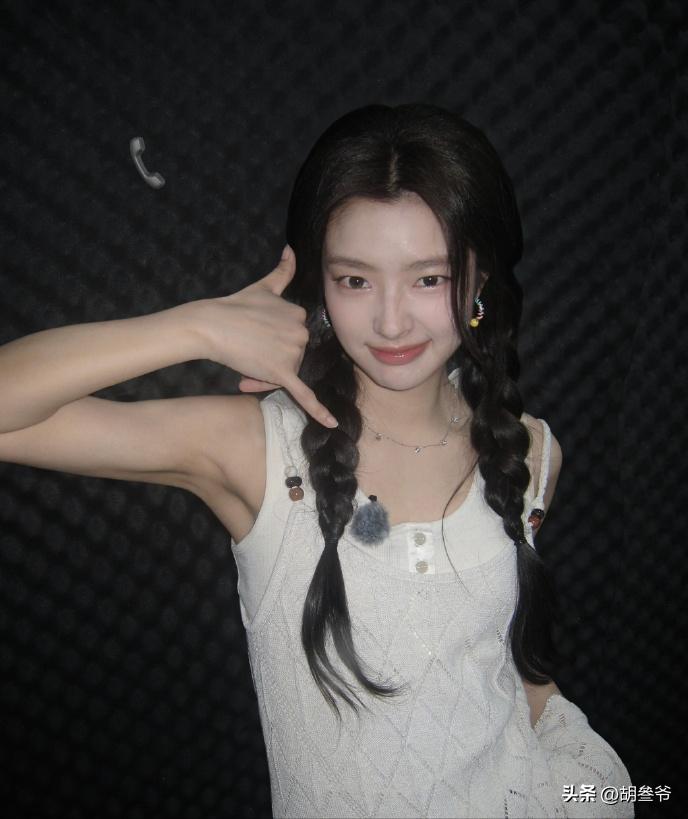 她把长发梳成了两条乖巧的麻花辫,辫梢微微蓬松,还特意加了假发片增加发量,试图打造显脸小的效果,整体造型软萌又可爱。
