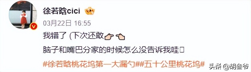 直播结束不到一小时,徐若晗就发了双马尾麻花辫自拍,配文“我错了(下次还敢)”,还主动带上#徐若晗桃花坞第一大漏勺#话题。