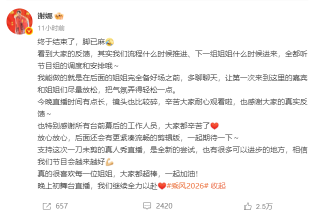 4月3日凌晨谢娜发文回应《乘风2026》直播节奏慢等争议,她表示,“其实我们流程什么时候推进、下一组姐姐什么时候进来,全都听节目组的调度和安排哦~后面还会有更紧凑流畅的剪辑版,支持这次一刀未剪的真人秀直播,是全新的尝试,也有很多可以进步的地方,相信我们节目会越来越好。”