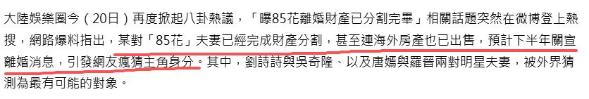 就在3月20日,有网友突然爆料“一线85花女星已完成离婚,海外财产分割完毕”。