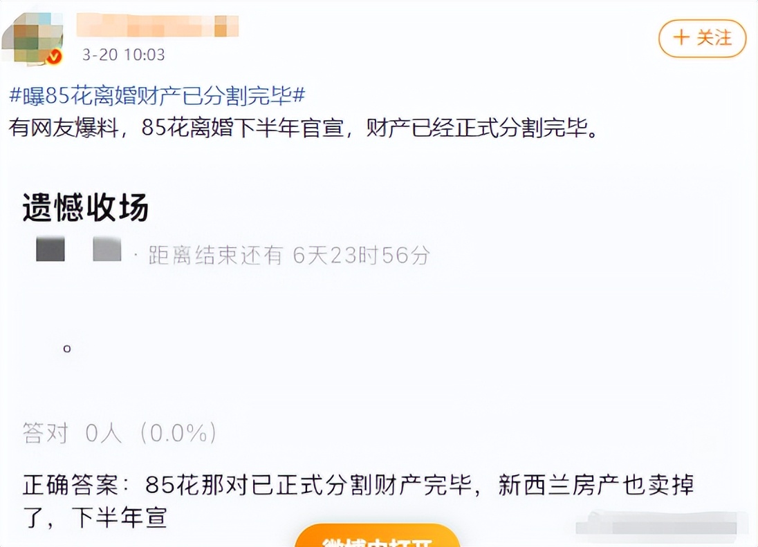 而此次娱乐圈的预言,依然是围绕着85花感情展开的,甚至说的有板有眼的,就连财产分割都爆料的清清楚楚,让网友们都开始了福尔摩斯模式。