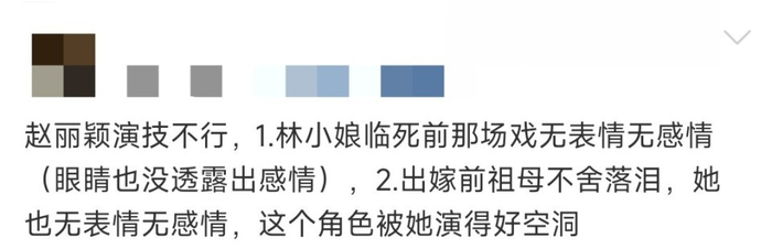 不管是在和剧中的“林小娘”对戏,听着“林小娘”用话语贬低自己的母亲的时候,还是在和剧中的“祖母”对戏,面对着祖母对着出嫁的自己不舍地流泪的时候,她的眼神都是空空如也,接不住戏。