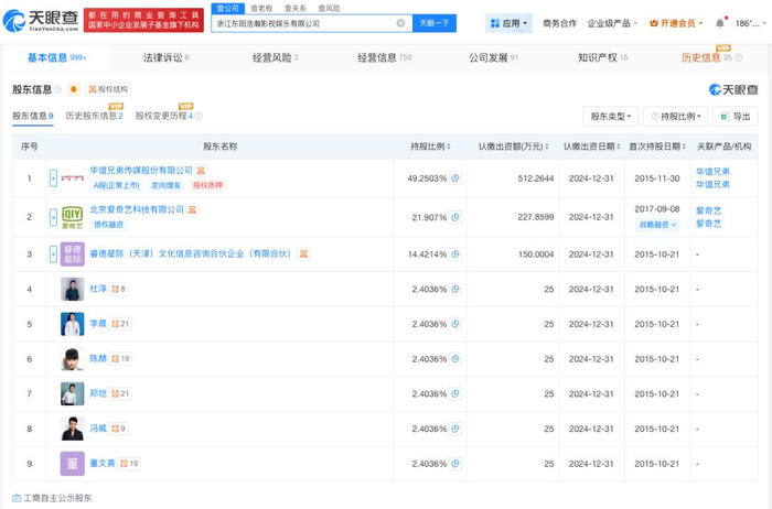 天眼查App显示,出品方浙江东阳浩瀚影视娱乐有限公司成立于2015年10月,法定代表人为刘韬,注册资本约1040万人民币,经营范围包括制作、复制、发行:专题、专栏、综艺、动画片、广播剧、电视剧等,由华谊兄弟传媒股份有限公司、杜淳、李晨、陈赫、郑恺、冯威(冯绍峰)等共同持股。