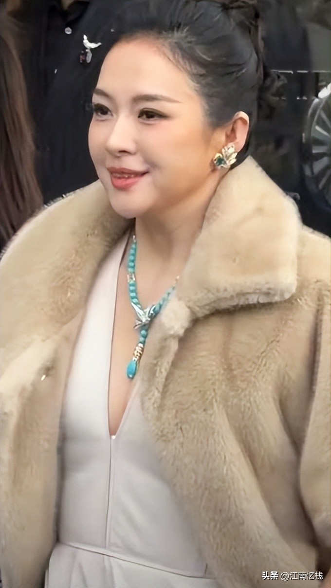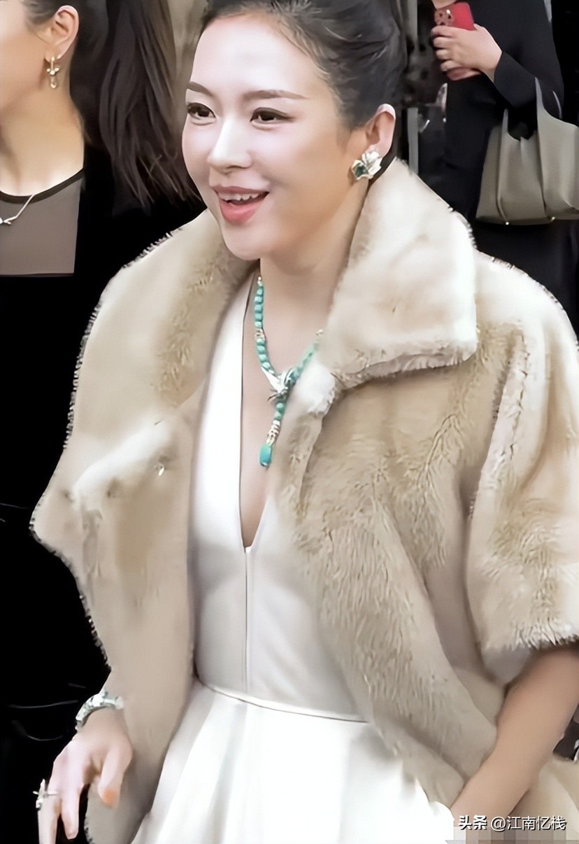 月初她出席北京一场珠宝品牌活动,穿白色深V裙搭皮草披肩,生图在网上疯传,评论区炸了锅。