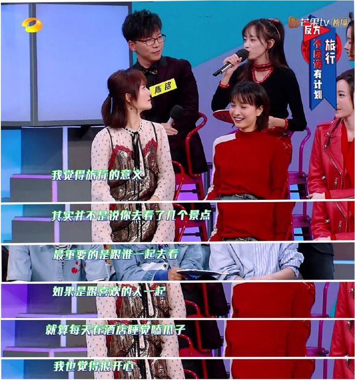 随后,进入到的是另外一个环节是辩论赛,主题是“旅行应不应该有计划”,蓝队为正方,红队为反方。黄婷婷很浪漫地提出,“旅行如果是跟喜欢的人每天在酒店睡觉嗑瓜子,也会觉得很开心。”