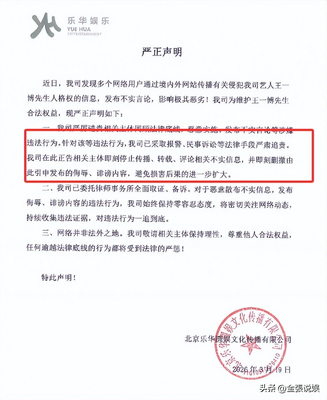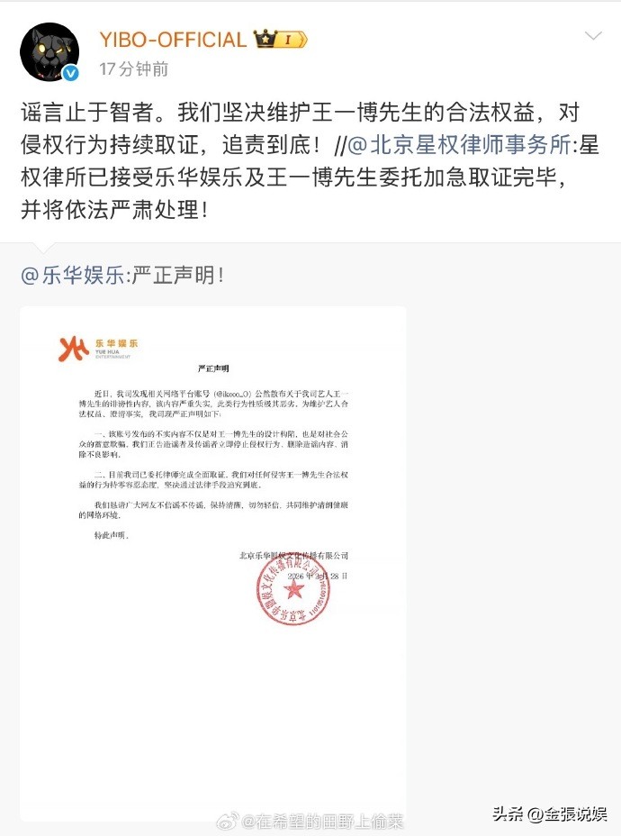 声明宣布:乐华已就相关造谣行为向警方报案,同时委托律师事务所全面取证备诉,针对微博、豆瓣上的多个传播节点账号,以人格权纠纷为由提起民事诉讼,法院已受理立案。